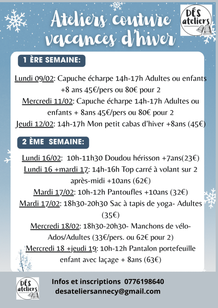 Je serai à la boutique Dés Ateliers la deuxiéme semaine, voici notre programme pour les vacances d’hiver 2026