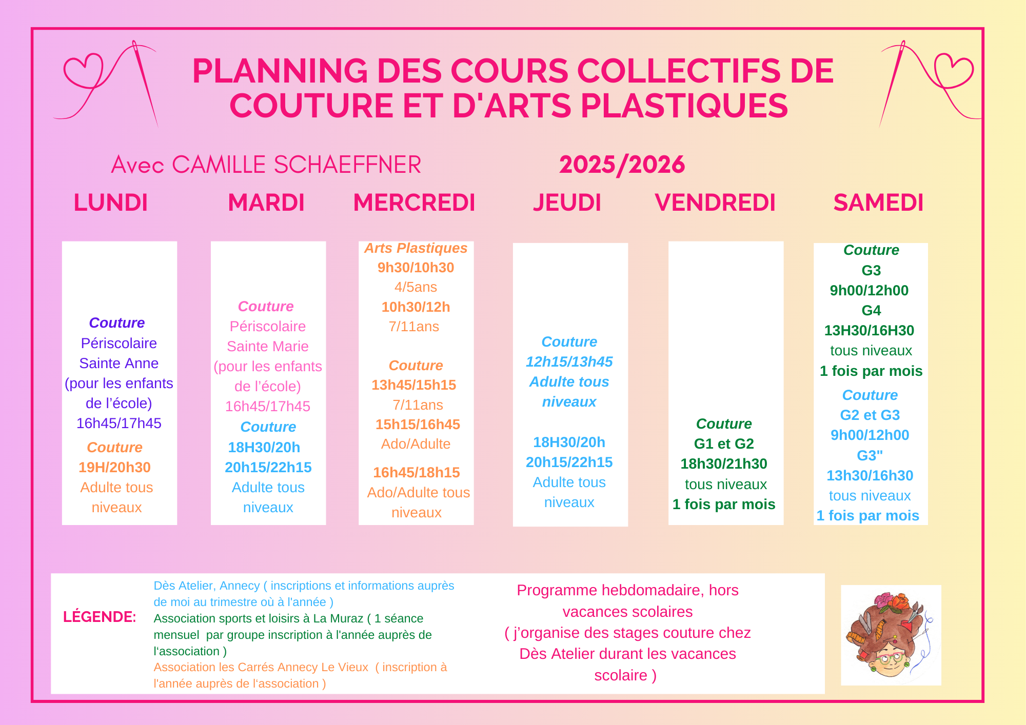 En cours en groupe depuis 4ans à la boutique Atelier « Dés Ateliers » au 17 avenue de Cran à Annecy ( où je suis en collocation avec Réjane Julliand » les p’tites cueillettes »), à l’Association sport et loisirs de La muraz depuis 10ans, à l’Association des carrés à Annecy Le Vieux depuis 6 ans, à l’école primaire privée Saint-Anne pour la 3ème année consécutive et depuis Janvier 2026 à l’école primaire Sainte-Marie à Annecy.